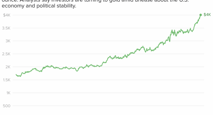 El oro brilla para los inversores y los precios suben a un ritmo Escribe $ 4000 en onzaY las razones detrás del brillante salto del metal pueden ser menos deslumbrantes, ya que los analistas de Wall Street dicen que refleja los crecientes inconvenientes de la economía y la estabilidad política de Estados Unidos.